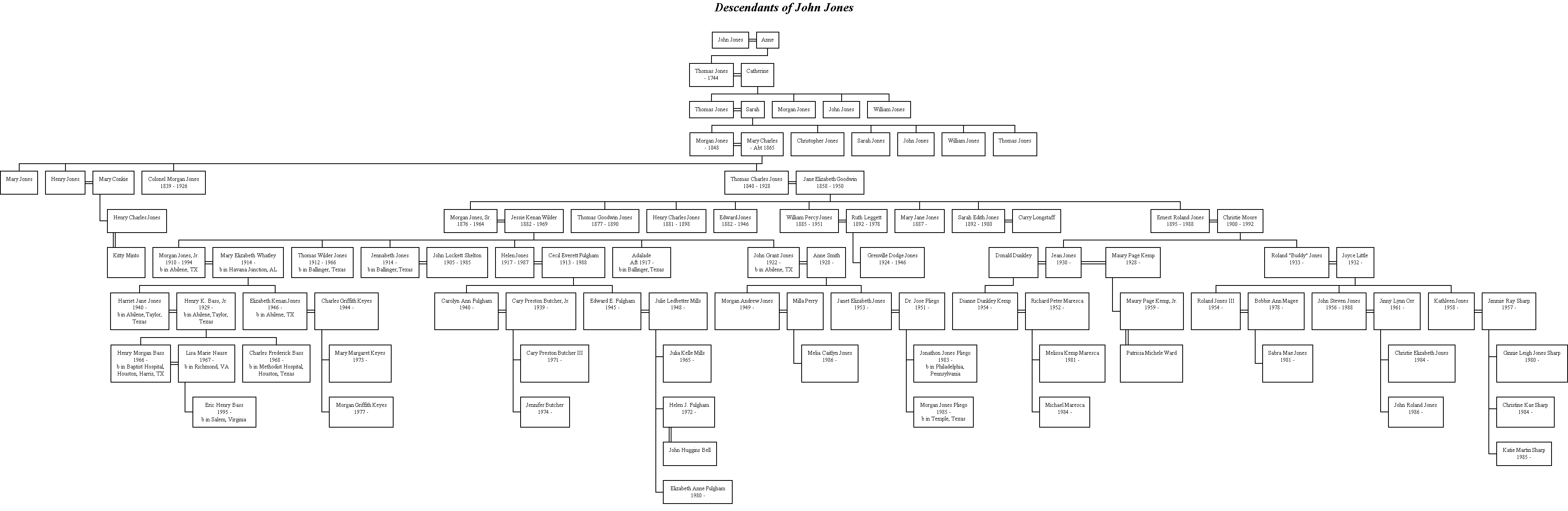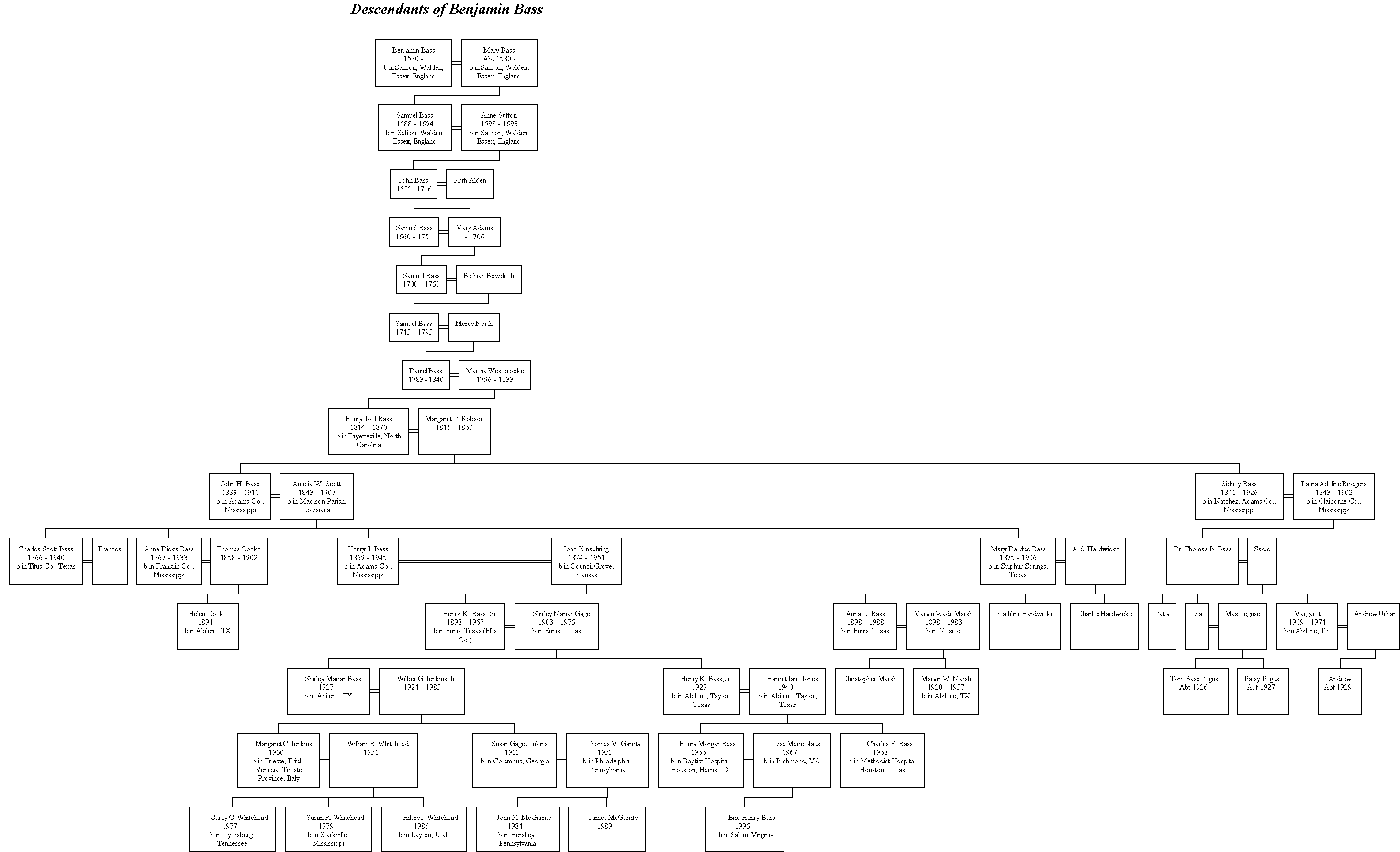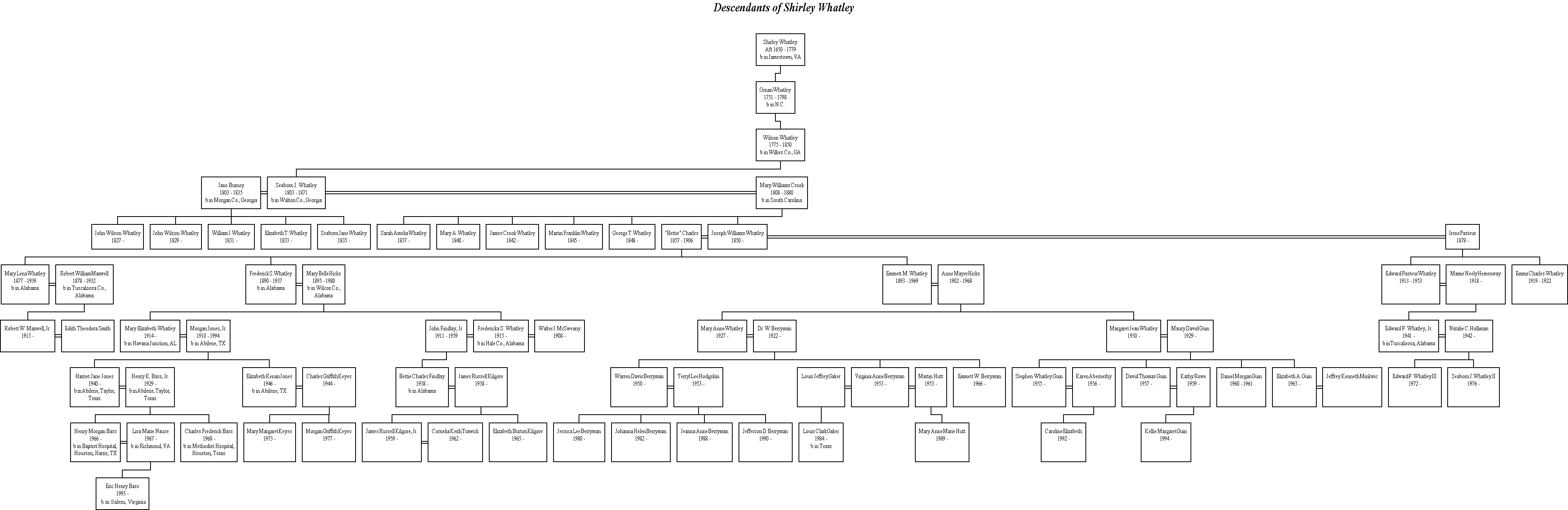 You can download a GIF image of the Bass family tree, the Jones family tree, or the Whatley family tree. They are quite large, physically, about 4000 pixels wide by 1300 to 1780 pixels tall. File size is approximately 75 kilobytes each.